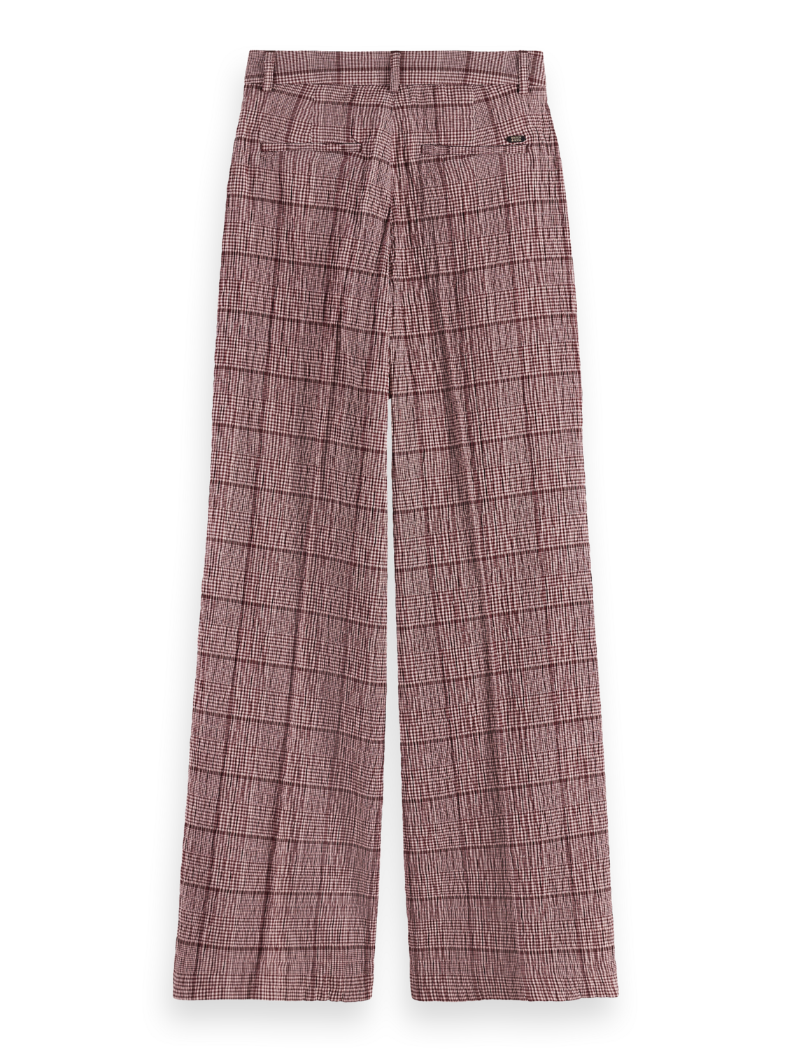 Combining a high-rise fit with a wide-leg silhouette in classic Prince of Wales check, these breathable seersucker trousers offer comfort and style for formal occasions.