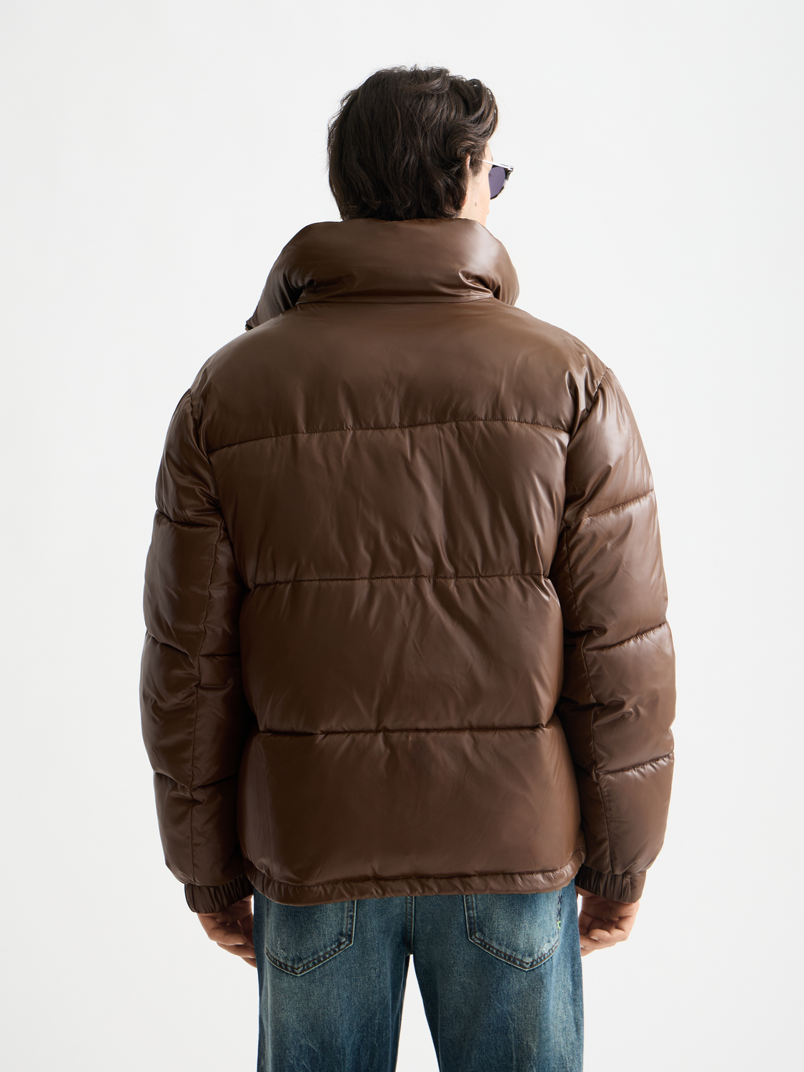 A high-shine puffer jacket with a bold lacquered finish and padded silhouette.